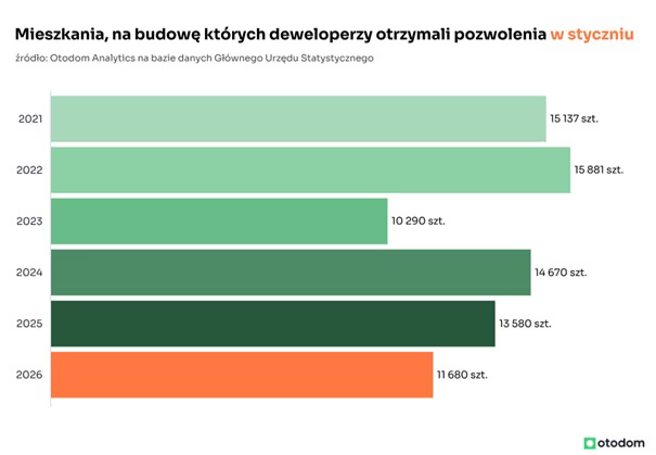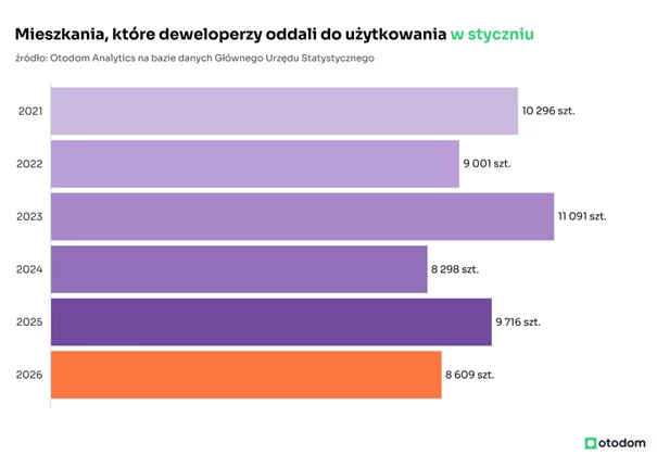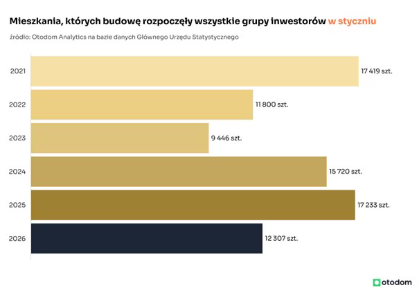 Efekty działań podjętych wówczas przez deweloperów powinniśmy oglądać w liczbie mieszkań oddanych w pierwszym półroczu bieżącego roku. Styczniowe dane wskazują, że te prognozy mogą się nie zrealizować w najbliższych miesiącach z powodu spowolnienia po stronie popytowej, które nastąpiło w okresie od 2024 r. do pierwszej połowy 2025 r. W rezultacie czas budowy inwestycji deweloperskich uległ wydłużeniu, dlatego większą liczbę mieszkań oddanych do użytkowania możemy zobaczyć w danych GUS dopiero w drugiej połowie 2026 roku.