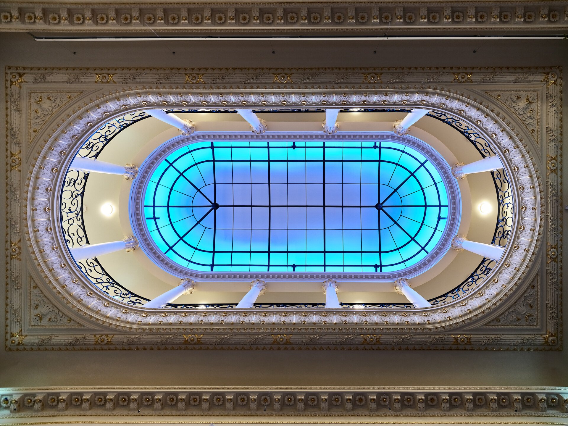 Odsłonięto dużą liczbę kamiennych detali elewacji, w szczególności w całości kamienny wykusz sali balowej na południowej elewacji. Dawną świetność odzyskał także oryginalny, neobarokowy sufit, zabudowany w latach 20-tych XX wieku. Stropy z dekoracją sztukatorską najpierw zostały pomalowane monochromatycznie, następnie podkreślono odrębnym kolorem najbardziej ozdobne detale w celu wydobycia ich formy. Podczas szczegółowych badań stratygraficznych zidentyfikowano miejsca pierwotnych złoceń i zostały one teraz pozłocone dużą ilością 24-karatowego złota w płatkach.