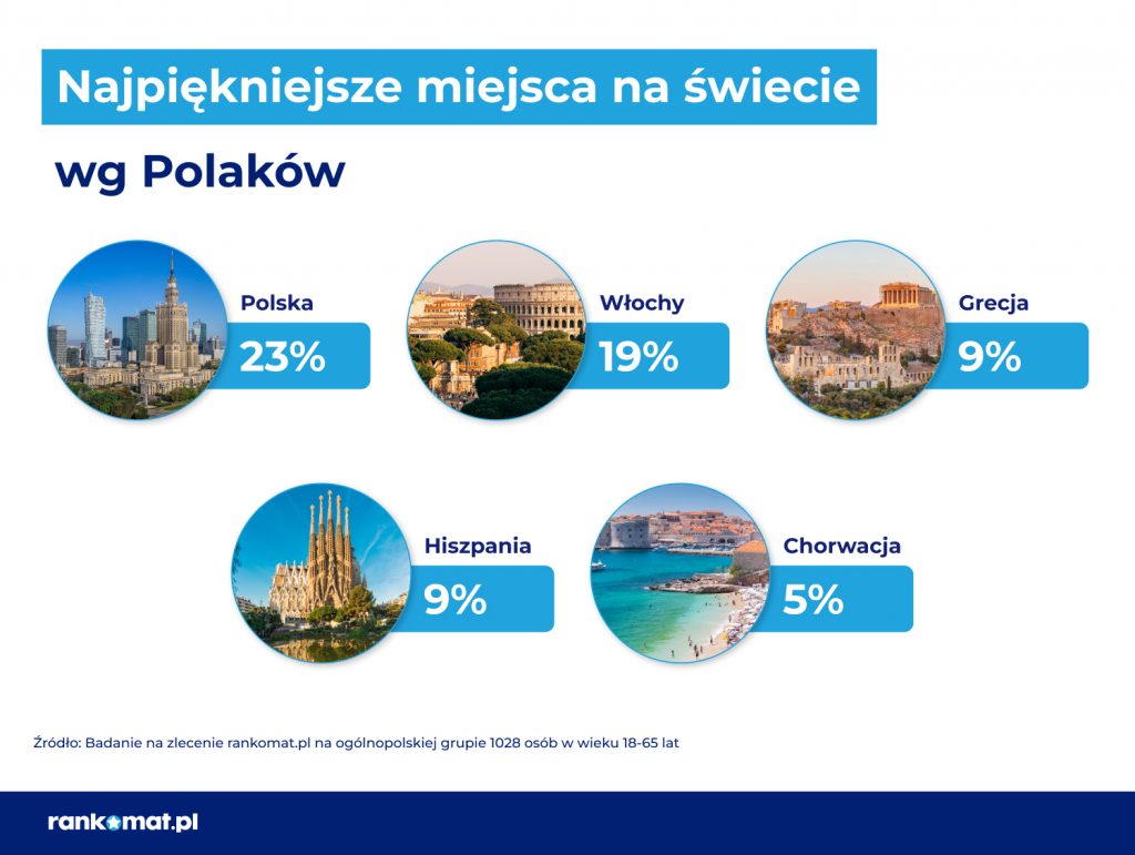 23% Polaków bez wahania stwierdziło, że nasz kraj jest najpiękniejszy na świecie. Pomimo rajskich plaż i cudów świata, majestatycznych gór i ikon filmowych, respondenci wiedzą, że wszędzie dobrze, ale w domu najlepiej. Na drugim miejscu z wynikiem 19% znalazły się Włochy. Proszeni o doprecyzowanie respondenci wskazywali głównie Rzym, Wenecję i Dolomity. Na trzecim miejscu ex aequo znalazła się Hiszpania i Grecja, które uzyskały po 9% wskazań. Po doprecyzowaniu badani wskazywali Barcelonę i Wyspy Kanaryjskie oraz Kretę i Rodos.