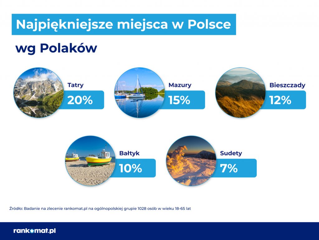 Co piąty Polak uważa, że najpiękniejszym miejscem w Polsce są Tatry, a co dziesiąty, że Bałtyk. Z kolei niemal co czwarty respondent, zapytany o najpiękniejsze miejsce na świecie, wskazał… Polskę. Tuż za nią uplasowały się Włochy – tak wynika z badania Rankomat.pl.