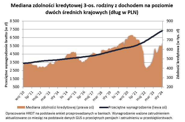 W efekcie zdolność kredytową trzyosobowej rodziny z dochodem na poziomie dwóch średnich krajowych banki oceniły teraz na trochę ponad 672 tys. złotych – wynika ze styczniowej ankiety przeprowadzonej przez HREIT. To o ponad 45% więcej niż przed rokiem.