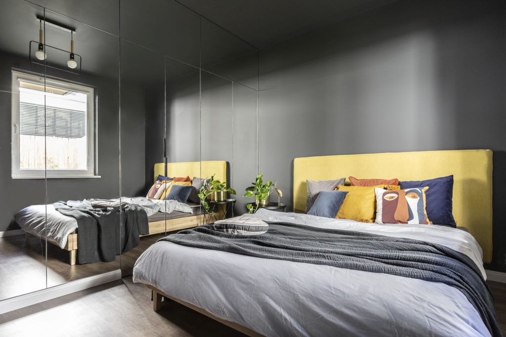 Sypialnia zgodnie z życzeniem inwestora przybrała ciemne, wyciszające barwy. Prosty, minimalistyczny wystrój urozmaicają detale, nawiązujące do loftowej stylistyki. Charakter tego wnętrza najlepiej oddaje wdzięczna nazwa koloru ścian: Nocna Wyprawa. Na tle grafitowych szarości wybija się aksamitny, musztardowy zagłówek łóżka. Jedną ze ścian w całości pokryto taflami luster, za którymi znalazła się obszerna garderoba.