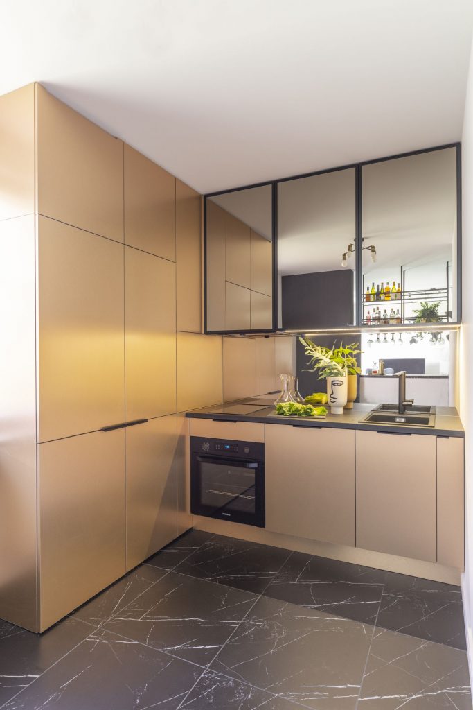 Nieszablonową paletę barw odnajdziemy również w kuchni. Pierwotny układ pomieszczenia był niefunkcjonalny i nie odpowiadał właścicielowi, dlatego architekci zdecydowali się go zmienić. Teraz kuchnia, choć niewielka, w zupełności spełnia oczekiwania inwestora, który zazwyczaj stołuje się na mieście. Fronty wysokiej zabudowy oraz dolnych szafek wykończono laminatem w modnym kolorze szczotkowanej miedzi. Natomiast w pasie roboczym oraz na frontach górnych szafek zastosowano brązowe lustro, w którym odbija się widok salonu. Ten zabieg pozwolił projektantom „oszukać” oko i nadać lekkości małej przestrzeni.