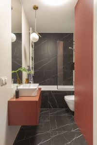 Łazienka to kwintesencja elegancji. Czarne płytki inspirowane marmurem doskonale harmonizują z wykonaną na wymiar zabudową oraz szafką umywalkową w kolorze ceglastego bordo. Kompozycyjną spójność oraz wyraźne nawiązania do wystroju pozostałych pomieszczeń odnajdziemy też w detalach: czarnych uchwytach mebli oraz czarnej ramce, w którą – podobnie jak fronty kuchennych szafek – ujęto parawan nawannowy.