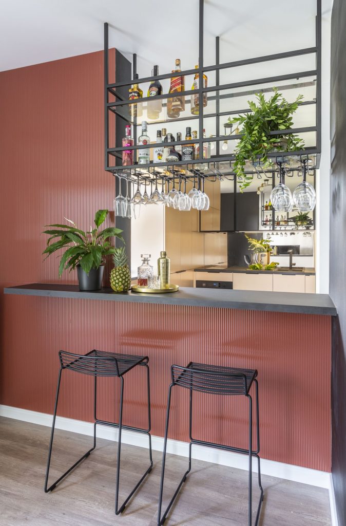 Inwestor lubi wysmakowane, klubowe klimaty – wysoko ceni elegancki, ponadczasowy styl oraz tzw. wnętrza z pazurem. Propozycja architektów Decoroom, by wykorzystać w aranżacji bardzo oryginalne i wyraziste zestawienie kolorystyczne czerni i bordo w ceglastym odcieniu spotkała się z entuzjastycznym przyjęciem z jego strony. Zastosowanie czarnej farby magnetycznej pozwoliło przygotować miejsce, gdzie właściciel będzie mógł w przyszłości wyeksponować swoją bogatą kolekcję magnesów. Dodatkowo, by wzmocnić wizualnie dekoracyjny efekt, ścianę przy barze wykończono ornamentowym prążkowanym szkłem w intrygującym kolorze ceglastego bordo. Jak na klubowe wnętrze przystało ponad barem ulokowano otwarty, czarny stelaż ze szklanymi półkami na alkohol i relingami na kieliszki. A jeśli ktoś jeszcze nie jest pewien, gdzie się znalazł, oryginalny ścienny neon rozwieje wszelkie wątpliwości.