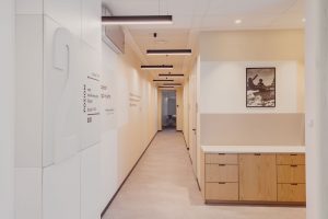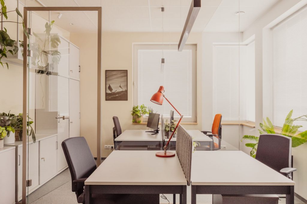 Biura i przestrzenie wspólne zostały starannie zaprojektowane z uwzględnieniem dużej ilości okien i wysokich szklanych drzwi, umożliwiających swobodne przenikanie światła i dodające lekkości całej przestrzeni. Przeszklenia, poza funkcją estetyczną, doświetlającą długie korytarze, nadając im przyjemny charakter. Kolorystyka projektu skoncentrowana jest wokół gamy szarości i beżu, gdzie kolory płynnie przechodzą ze ścian na sufit, kreując eleganckie, geometryczne kompozycje. Czarne detale w meblach, oświetleniu i grafice tworzą oryginalny kontrast i dodają głębi.