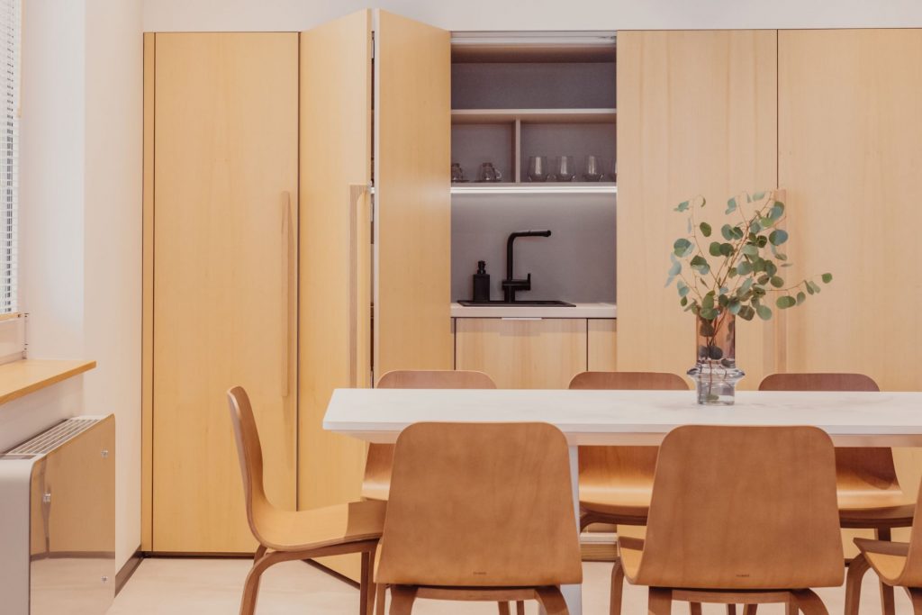 Ostatnia kondygnacja budynku, niemal w całości pełni funkcję konferencyjną. Z myślą o potrzebach firmy, która regularnie organizuje szkolenia dla klientów, ta przestrzeń została wyjątkowo starannie zaprojektowana. Oddzielona szklaną ścianą jadalnia może być dostosowana do elastycznych potrzeb. Możliwość je złożenia ściany pozwala też powiększyć przestrzeń konferencyjną. Dodatkowo, sala konferencyjna wyposażona jest w aneks kuchenny, który został sprytnie ukryty za przesuwnymi frontami, dbając o estetykę i utrzymanie porządku przy codziennym użytkowaniu.
