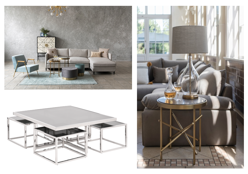 W dużych salonach sprawdzą się stoliki pokaźnych rozmiarów, jak np. Brooklyn czy Cruz z pięknym marmurowym blatem, którym mogą towarzyszyć ich skromniejsze gabarytowo odpowiedniki z tej samej linii.