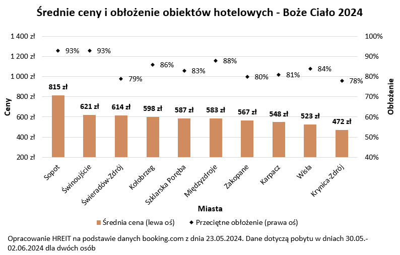 Na drugim biegunie zestawienia mamy Wisłę i Krynicę-Zdrój. Tam przy okazji Bożego Ciała para zapłaci za dobę średnio od 470 do około 520 złotych. Są to najniższe stawki w gronie przebadanych kurortów. Warto dodać, że i tu wynajętych jest już około 80% dostępnych pokoi hotelowych.