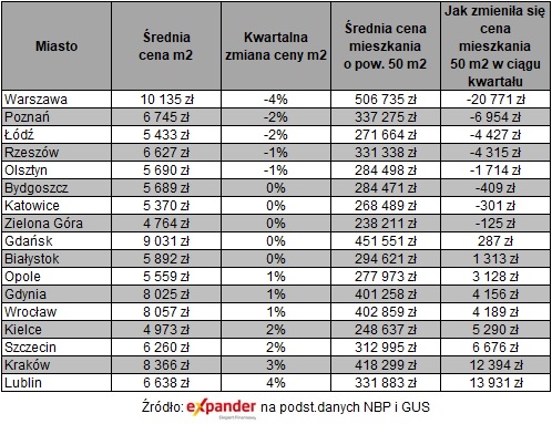 (9 153 zł za m2), jak i dziecięciu kolejnych dużych miast (6 680 zł za m2), są na najwyższych poziomach w historii. Rekordowe stawki pojawiły się bowiem aż w 13 z 17 miast badanych przez NBP. Średnia cena metra kwadratowego nowego mieszkania wzrosła o 3% w porównaniu z ostatnim kwartałem ubiegłego roku, i o 7% w odniesieniu do stawek przed rokiem. Spadki są natomiast rzadkością. Zaobserwowano je jedynie w Łodzi (-2% k/k), Lublinie (-1% k/k) i Zielonej Górze (-1% k/k).