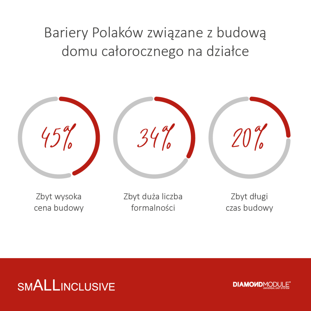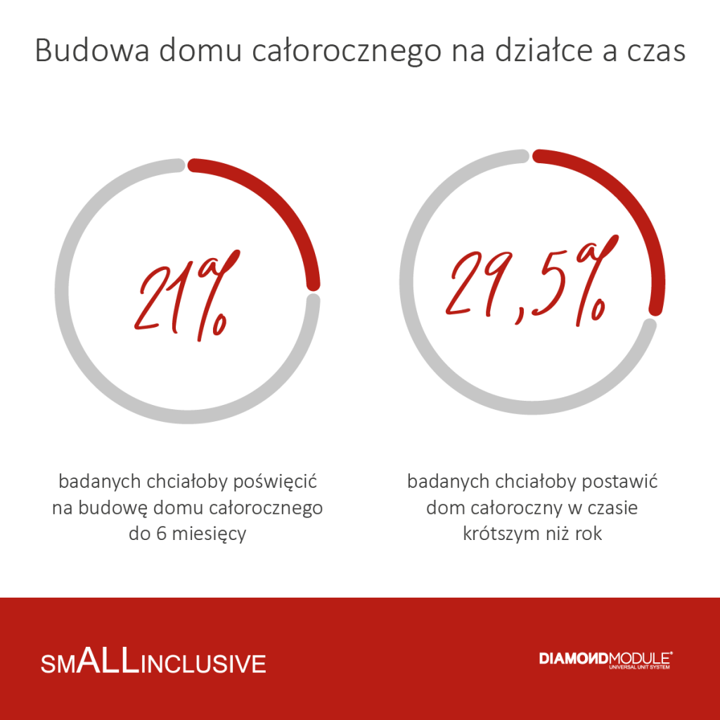 Również eksperci Diamond Module, specjalizujący się w budownictwie modułowym, zauważyli zmianę dotyczącą postrzegania przez Polaków własnego kawałka ziemi, na której można postawić dom. Firma przeprowadziła badanie, z którego wynika, że Polacy interesują się postawieniem domu na działce, w czasie nie dłuższym niż 12 miesięcy, a właśnie zbyt długi czas budowy ich skutecznie do tego zniechęca. Przy budowie domu od podstaw nie ma jednak możliwości skrócenie tego procesu: sprawy administracyjne związane z uzyskaniem pozwoleń, tworzenie projektu, poszukiwanie dobrej ekipy, prace budowlane i wykończeniowe trwają. Inaczej jest w przypadku całorocznych domów modułowych, których stworzenie jest po prostu szybkie i przekonały się o tym osoby, które zdecydowały się na własne lokum wykończone „pod klucz”, stworzone w zaledwie miesiąc.