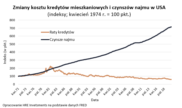 Jeśli więc kogoś nie przekonują dane z Polski, to zawsze radą służą te z USA. Jest to chyba najlepiej zbadany rynek nieruchomości na świecie. Dlatego tam też najłatwiej znaleźć bardzo różne informacje, które do tego sięgają daleko w przeszłość. Nie inaczej jest tym razem. Na stronach Rezerwy Federalnej znaleźć możemy więc dane na temat tego jak zmieniały się czynsze najmu, ale też takie, które pokazują jak zmieniał się koszt kredytu. Efekt? Podczas gdy w latach 1971-2021 czynsze najmu wzrosły o 615%, to koszt kredytu fluktuował i dziś jest o 40% niższy niż w punkcie startowym. Przy tym mieliśmy też do czynienia z epizodem znacznie wyższych cen kredytów. W skrajnym przypadku kredyty były o 125% droższe niż w punkcie startowym.