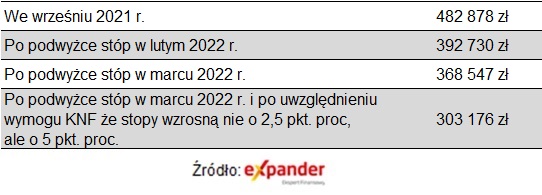 Zdolność kredytowa najbardziej spadnie natomiast w tych bankach, które dotychczas stosowały tylko minimalne wymogi, czyli zakładały wzrost stóp procentowych o 2,5 pkt. proc. Dla przykładu jeśli z wyliczeń takiego banku wynika, że kogoś stać na spłatę raty wynoszącej nie więcej niż 3000 zł, to dotychczas mógł liczyć na ok. 393 000 zł. Po marcowej podwyżce stóp procentowych i uwzględnieniu dodatkowych podwyżek o 5 pkt. proc. ta dostępna kwota kredytu spadnie do 303 000 zł, czyli aż o 90 000 zł. To przy założeniu okresu spłaty 25 lat i marży 2,48% (średnia przy 10% wkładzie własnym). Dla porównania jeszcze we wrześniu 2021 r. taka osoba mogła liczyć na 483 00 zł. Od tego czasu dostępna kwota spadła więc aż o 180 000 zł.