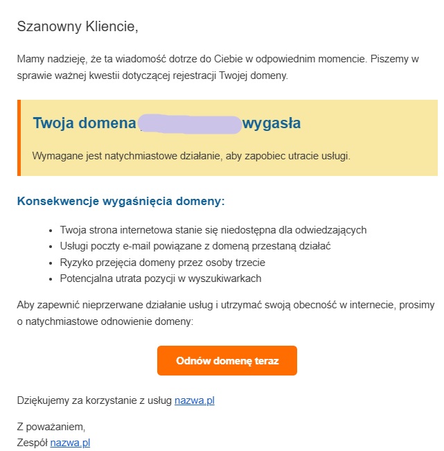 Analitycy ESET zauważyli, że przed świętami Bożego Narodzenia oszuści rozpoczęli wysyłkę maili, w którym przypominają o wygaśnięciu domeny zakupionej w firmie nazwa.pl i zachęcają do odnowienia przez płatność online. Oszuści straszą w mailu, że brak płatności będzie skutkować natychmiastową niedostępnością strony, wyłączeniem usług poczty e-mail powiązanej z domeną, stratą pozycji w wyszukiwarkach i ryzykiem przejęcia strony przez osoby trzecie.