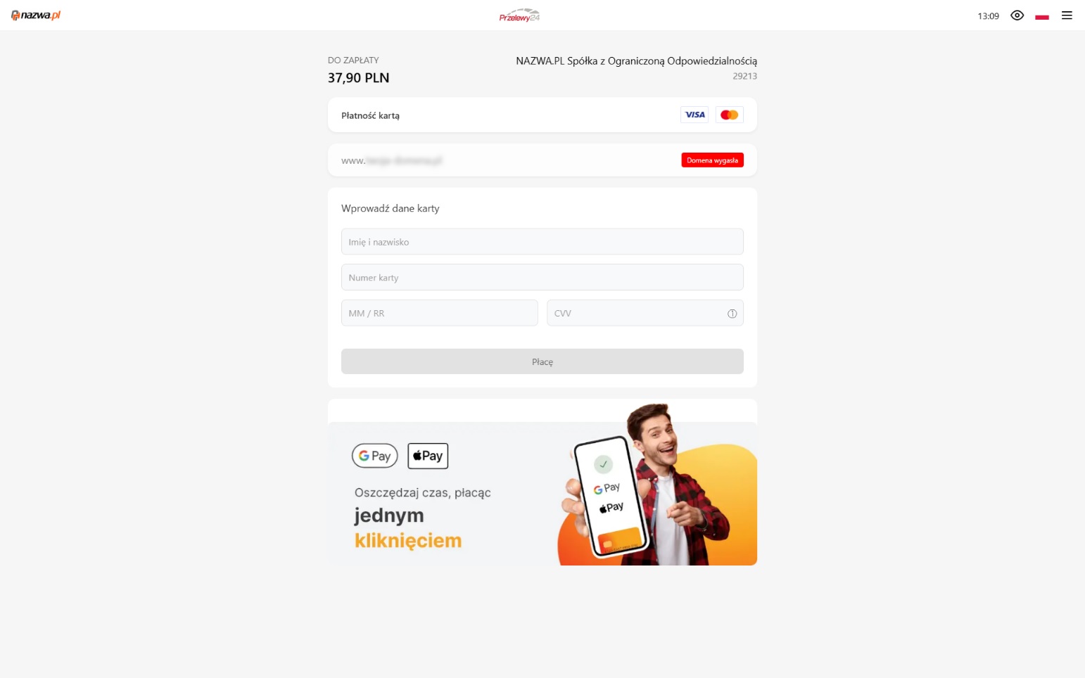 Po zalogowaniu użytkownik proszony jest o wprowadzenie danych karty płatniczej pod pretekstem zapłaty kwoty 37,90 zł za przedłużenie domeny.
