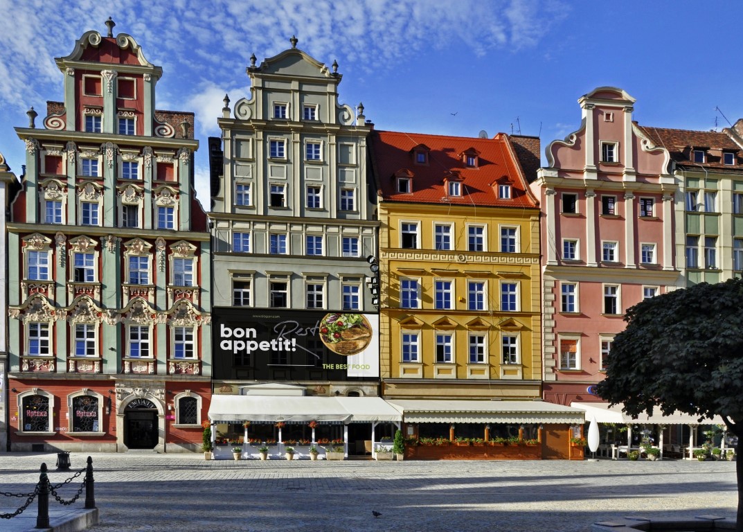 Facades of old historic tenements on Rynek (Market Square) in Wroclaw (Breslau), Poland