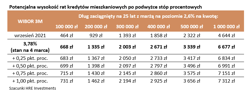 Niestety prognozy sugerują, że to wciąż nie koniec podwyżek. Jeszcze przed agresją Rosji na Ukrainę spodziewano się, że podstawowa stopa procentowa pójdzie w górę do poziomu około 4 – 4,5%. Teraz prognozy te przesunęły się w górę – nawet w okolice 5%. Przewidywania te mogą oczywiście okazać się nadmiernie napompowane ze względu na panującą na rynkach niepewność. Tak wyraźna podwyżka stóp procentowych odbiłaby się przecież na tempie wzrostu gospodarczego. Ten i tak pozostaje pod presją m.in. szybko rosnących cen energii. Gdyby jednak okazało się, że Rada Polityki Pieniężnej zajdzie w swoich decyzjach aż tak daleko, to przy podstawowej stopie procentowej wywindowanej w okolice 5%, raty kredytów wzrosłyby o około 2/3 względem poziomu z września ubiegłego roku.