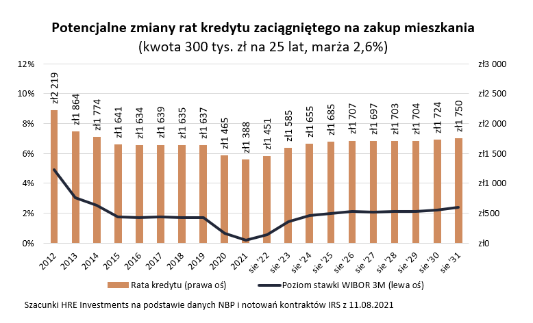 Aby jednak trochę ostudzić ewentualny nadmierny optymizm należy dodać, że choć bezrobocie spada, wynagrodzenia rodaków dynamicznie rosną – tak samo zresztą jak ceny mieszkań, a do tego kredyty są rekordowo tanie, to nie zawsze tak będzie. Szczególnie często mówi się ostatnio o potencjalnie rosnących stopach procentowych, które spowodują, że raty większości kredytów hipotecznych pójdą w górę. I choć podwyżek stóp procentowych ekonomiści nieskutecznie spodziewają się od około 8 lat, to jednak jedno jest pewne – one w końcu nastąpią. Jeśli wierzyć prognozom, to na podwyżkę czekać będziemy co najwyżej kilka miesięcy. Przy tym rynek spodziewa się podwyżki raczej symbolicznej, która może podnieść ratę o zaledwie kilka – kilkanaście złotych w przeliczeniu na każde 100 tysięcy pożyczonego kapitału. W dłuższej pespektywie dzisiejsze prognozy sugerują, na przykład że raty w ciągu 3 lat wzrosną o 15-20%.