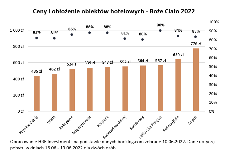 561 zł – tyle średnio przyjdzie nam zapłacić za nocleg dla dwóch osób jeśli zdecydujemy się na wypoczynek podczas tegorocznego Bożego Ciała (weekend 16-19 czerwca) – wynika z szacunków HRE Investments opartych o dane popularnego portalu rezerwacyjnego. Są to stawki, na które muszą się przygotować Ci, którzy zwlekali z rezerwacją miejsc do ostatniej chwili, czyli rozpoczęli poszukiwania na niespełna tydzień przed długim weekendem.