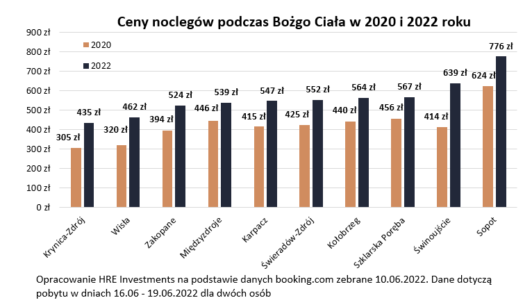 Póki co jednak we wszystkich miejscowościach, w których Polacy najbardziej lubią odpoczywać, aktualne stawki za nocleg są wyraźnie wyższe niż były w roku 2020. Przeciętnie w lokalizacjach tych noclegi zdrożały o 32%. Tak przynajmniej wynika z porównania danych na temat średnich stawek za noclegi zbieranych na kilka dni przed Bożym Ciałem w latach 2020 i 2022.