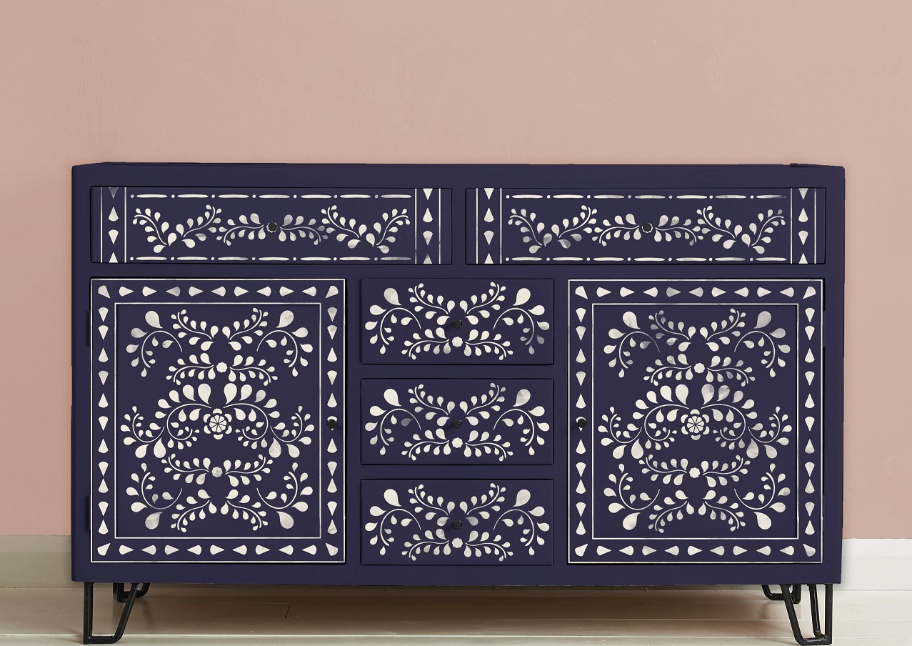 Podczas wyprawy do Radżastanu uwagę artystki zwróciły tradycyjne indyjskie meble inkrustowane kością. Stały się one inspiracją do stworzenia szablonu Faux Bone Inlay. Szablon składa się z trzech oddzielnych elementów, w tym głównego wzoru oraz wyboru obramowań i narożników, które w połączeniu dają projekt w formacie A3. W zestawie znajdują się również elementy mniejszych zdobień, które pozwolą nam spersonalizować wzór.