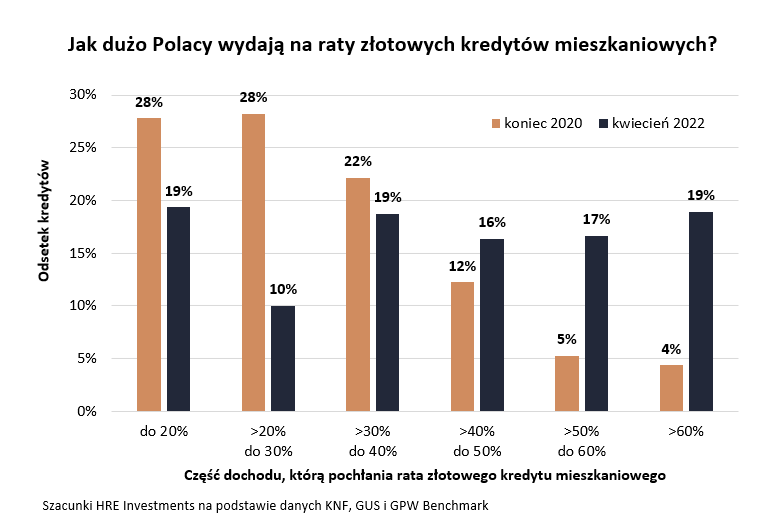 Gdy wejdziemy w szczegóły, to okaże się ponadto, że tak jak jeszcze pod koniec 2020 roku mniej niż 10% kredytobiorców wydawało na ratę ponad połowę wynagrodzenia, to dziś ten odsetek mógł wzrosnąć nawet czterokrotnie. Z szacunków HRE Investments wynika bowiem, że dziś na obsługę kredytu mieszkaniowego, nawet 35-40% rodaków może wydawać ponad połowę pensji. Oni wszyscy teoretycznie spełniają jeden z podstawowych warunków kwalifikujących do wsparcia w ramach Funduszu Wsparcia Kredytobiorców. Już dziś można się więc spodziewać, że banki będą musiały uzupełnić kapitał, którym ten fundusz dysponuje, bo szybko może się okazać, że pieniędzy w nim po prostu zabraknie.
