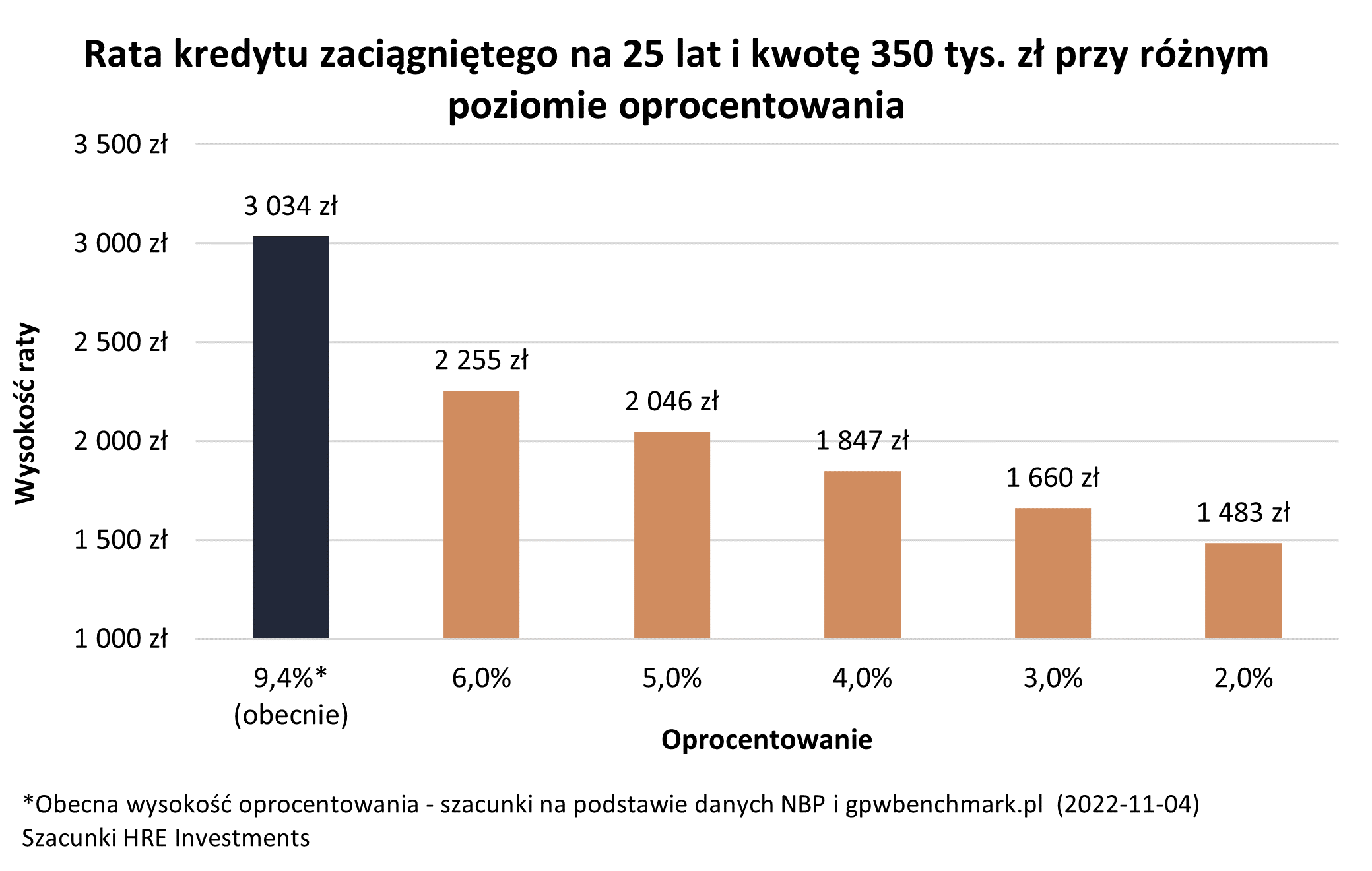 W praktyce oznacza to znacznie niższe raty niż te obowiązujące obecnie. Z szacunków HRE Investments wynika bowiem, że dziś kredyty sprzedawane są z oprocentowaniem na poziomie 9,4%. Przy długu zaciągniętym na 25 lat i kwotę 350 tys. złotych oznacza to ratę na poziomie ponad 3 tys. zł miesięcznie. Gdyby oprocentowanie to spadło do 6% rata nie przekraczałaby 2,3 tys. zł miesięcznie. Przy oprocentowaniu na poziomie 2% w skali roku do banku trzeba by oddawać mniej niż 1,5 tys. zł miesięcznie.