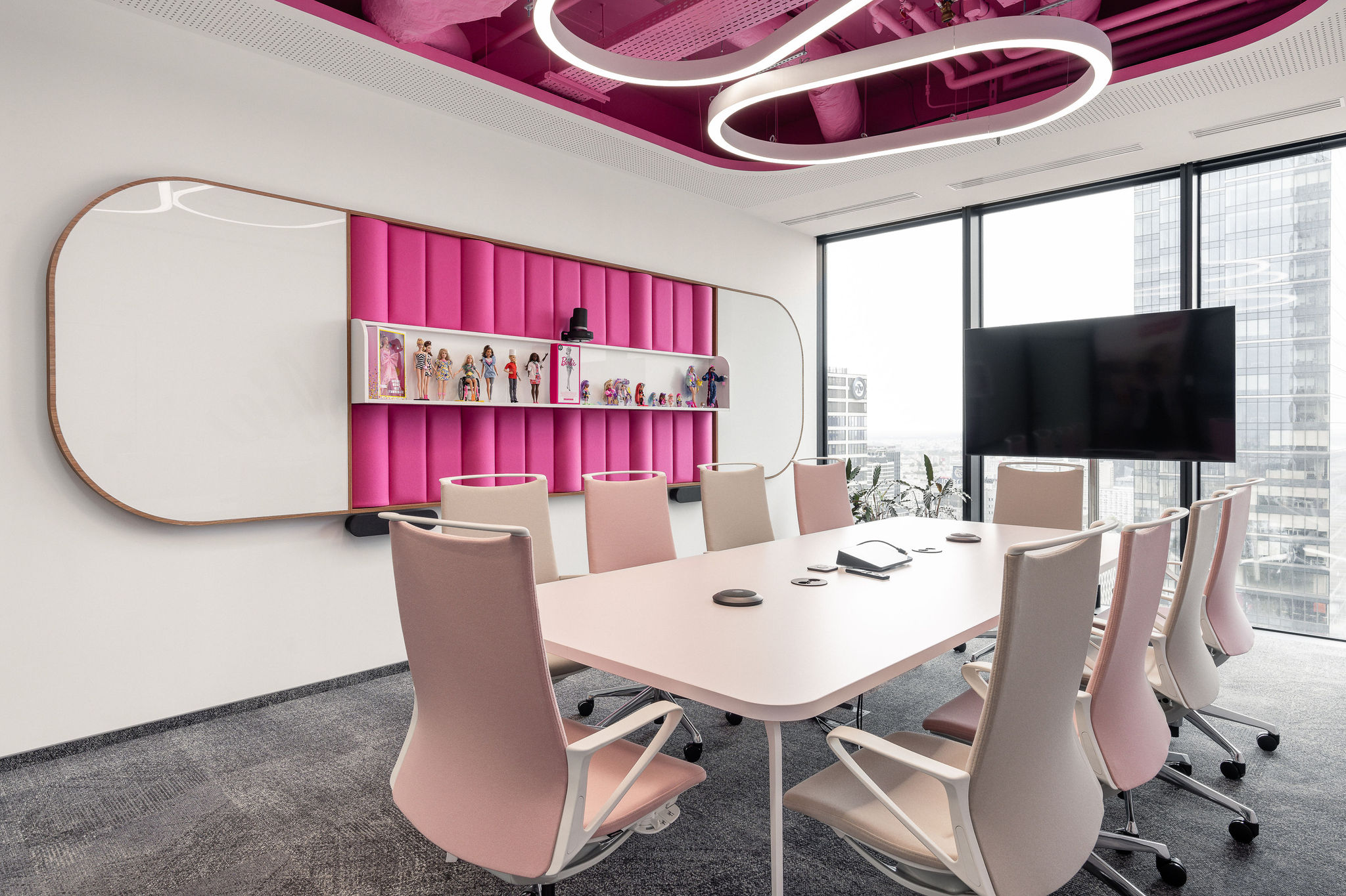 Z kolei przestrzenie kreatywne, przeznaczone do pracy zespołowej, burzy mózgów czy spotkań, korzystają z zupełnie innej dynamiki kolorystycznej, w której pojawiają bardziej nasycone i energetyczne akcenty, takie jak żółcie, pomarańcze czy czerwieni, pobudzające do działania i wzmacniające interakcje.