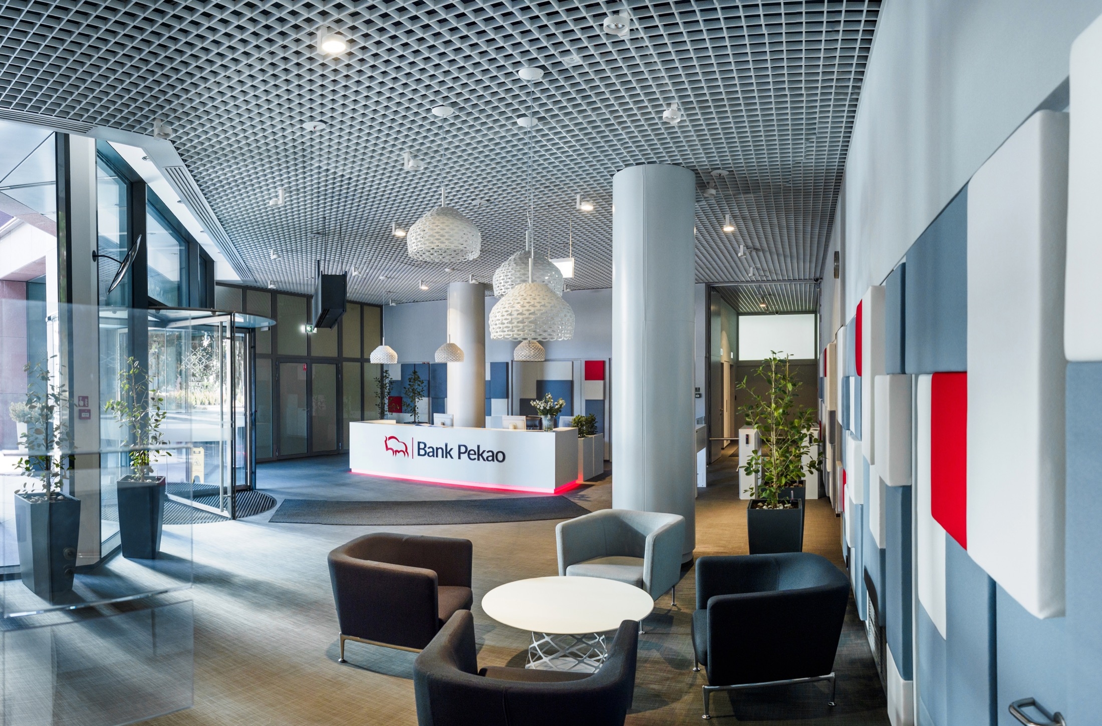 Bank Pekao SA miał ciekawy pomysł – ubrać recepcję w nowe szaty, bez ingerowania w oryginalne wykończenie tej przestrzeni. Nową aranżację holu zlecono firmie Tétris, której zadaniem było zaprojektowanie i przebudowa wnętrza w modelu Design & Build. Dobra koordynacja i szybkość prac były konieczne, ponieważ prace prowadzono na działającym, codziennie otwartym, obiekcie biurowym. Remont trwał cztery tygodnie, w tym weekendy.