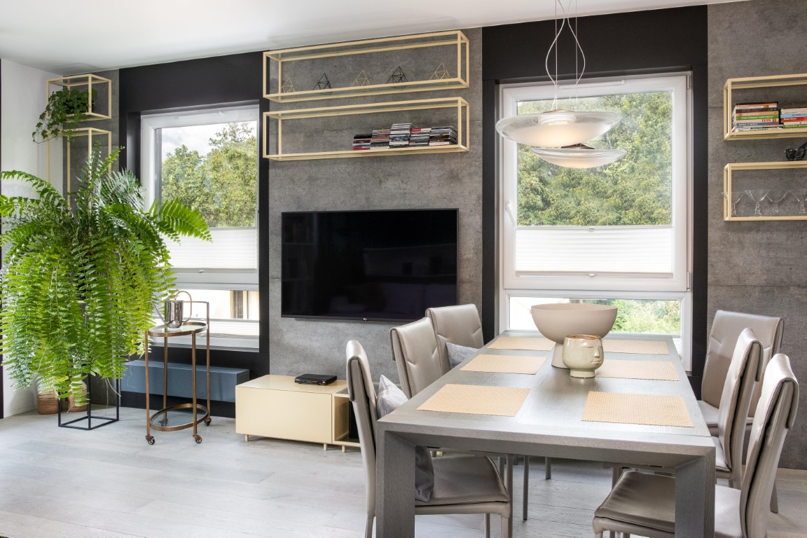 – Zamiast umieszczać telewizor w centralnym punkcie na środku pustej ściany, spróbujmy wbudować go w otoczenie, np. w regał z książkami. Takie rozwiązanie sprawi, że odbiornik stanie się częścią pewnej spójnej całości. Inną opcją jest stworzenie kompozycji, której częścią jest telewizor albo zastosowanie ciemnego tła za urządzeniem, dzięki czemu nie będzie tak bardzo odznaczał się na ścianie – radzi Ida Mikołajska.