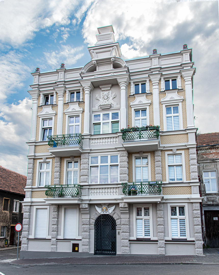 To właśnie tutaj w śródmieściu Kożuchowa, na skrzyżowaniu ulic Traugutta i Słowackiego znajduje się trójkondygnacyjna kamienica, która została wybudowana pod koniec XIX wieku. Baczny obserwator z pewnością zwróci uwagę na mocno dekoracyjną elewację frontową, pokrytą jasną klinkierową okładziną ceglaną zestawioną z partiami tynkowanymi, ozdobioną sztukaterią i zwieńczoną attyką. Choć autor projektu nie jest znany, to patrząc na zastosowany głęboki detal architektoniczny w postaci gzymsów, boniowania, opasek, płycin i motywów ornamentalnych można odnieść wrażenie, że architekt czerpał z wielu stylistyk – barokowej i klasycystycznej. Świetność budynku wpisanego do rejestru zabytków do niedawna można było podziwiać tylko na archiwalnych pocztówkach z przełomu XIX i XX wieku. Ukazywały one w pełnej krasie zabudowę dawnego Denkmalplatz z pomnikiem wojennym i okazałą kamienicą, która górowała nad placem.