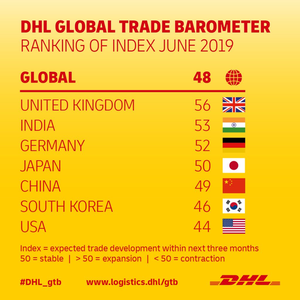 Barometr Globalnego Handlu DHL, narzędzie wykazujące obecny i przyszły stan rozwoju światowego handlu, wskazuje na jego nieznaczny spadek w najbliższych miesiącach. Światowy handel – prognozowany przez przepływy handlowe – ma się zmniejszyć w ciągu najbliższych trzech miesięcy o 8 punktów, osiągając wartość 48. Wyniki poniżej 50 punktów są uznawane za handlową stagnację.