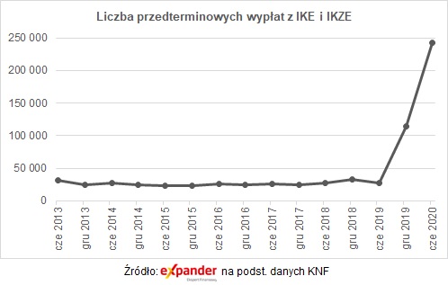 Kryzys związany z pandemią zmusił wiele osób do sięgnięcia po oszczędności, także te odkładane z myślą o emeryturze. Z danych KNF wynika, że w I półroczu 2020 r. aż na 242 tysiącach kont IKE i IKZE dokonano wypłat przedterminowych, czyli osobom, które nie ukończyły jeszcze 60/65 lat.