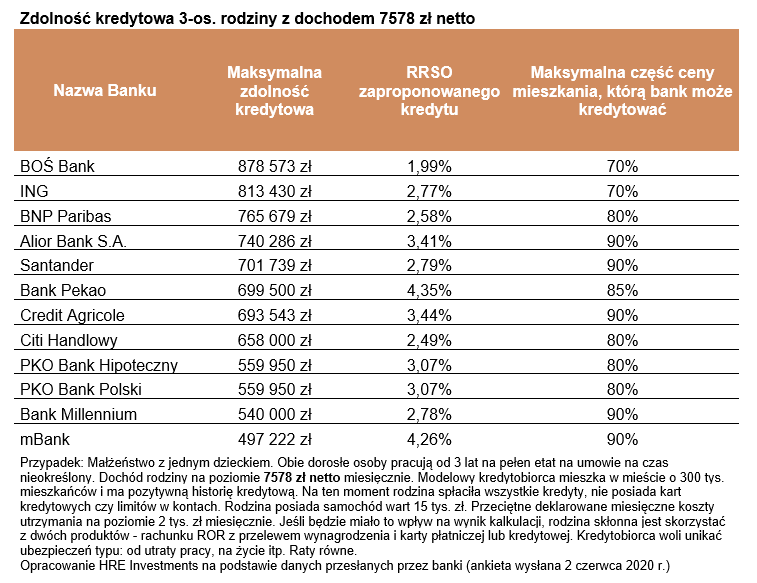 Informacje o zdolności kredytowej są więc pozytywne, ale trzeba do nich dodać kilka zdań wyjaśnienia. Wzrost zdolności kredytowej to przede wszystkim zasługa wcześniej wspominanej Rady Polityki Pieniężnej, która mocno obniżyła poziom stóp procentowych, a więc wpłynęła na spadek oprocentowania kredytów. Tak wysoka zdolność kredytowa jest ponadto pokłosiem dość optymistycznych założeń – dysponowania solidnym wkładem własnym, czy brakiem innych zobowiązań finansowych przy dobrej historii kredytowej. Do tego założono, że oboje rodzice mają pracę, a ich pensje zostały oszacowane na podstawie danych GUS za okres od maja 2019 do kwietnia 2020 roku. Ponadto te dane pomijają tzw. „śmieciówki”, pensje w małych firmach i administracji publicznej, co bez wątpienia zawyża przyjętą stawkę przeciętnego wynagrodzenia.