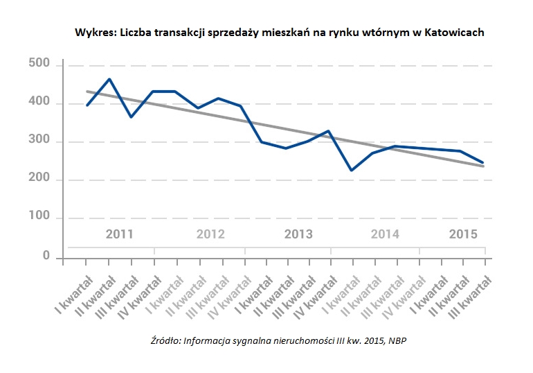 Jak wynika z kwartalnych raportów NBP, rok 2015 jest czwartym rokiem z rzędu, w którym spada liczba transakcji na wtórnym rynku mieszkań w Katowicach. Podczas, gdy jeszcze w II kwartale 2011 roku Urząd Miasta Katowice odnotował ponad 450 umów sprzedaży, tak w III kwartale 2015 liczba ta spadła w okolice 250.