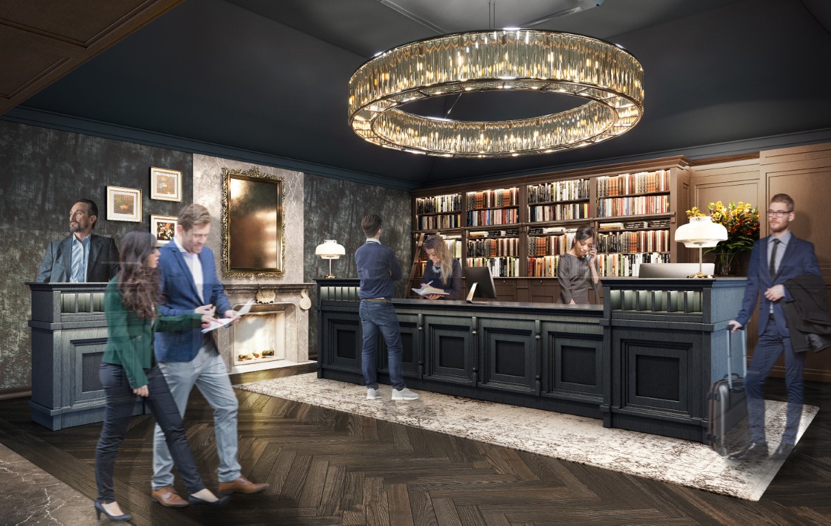 Recepcja w hotelu została zaprojektowana jako miejsce kameralne, dające poczucie komfortu oraz prywatności. W jej centralnej części znajdzie się lada recepcyjna, a nad nią odpowiednio wyeksponowana, wisząca lampa. Kominek oraz regał z książkami dodatkowo ocieplą tę przestrzeń.