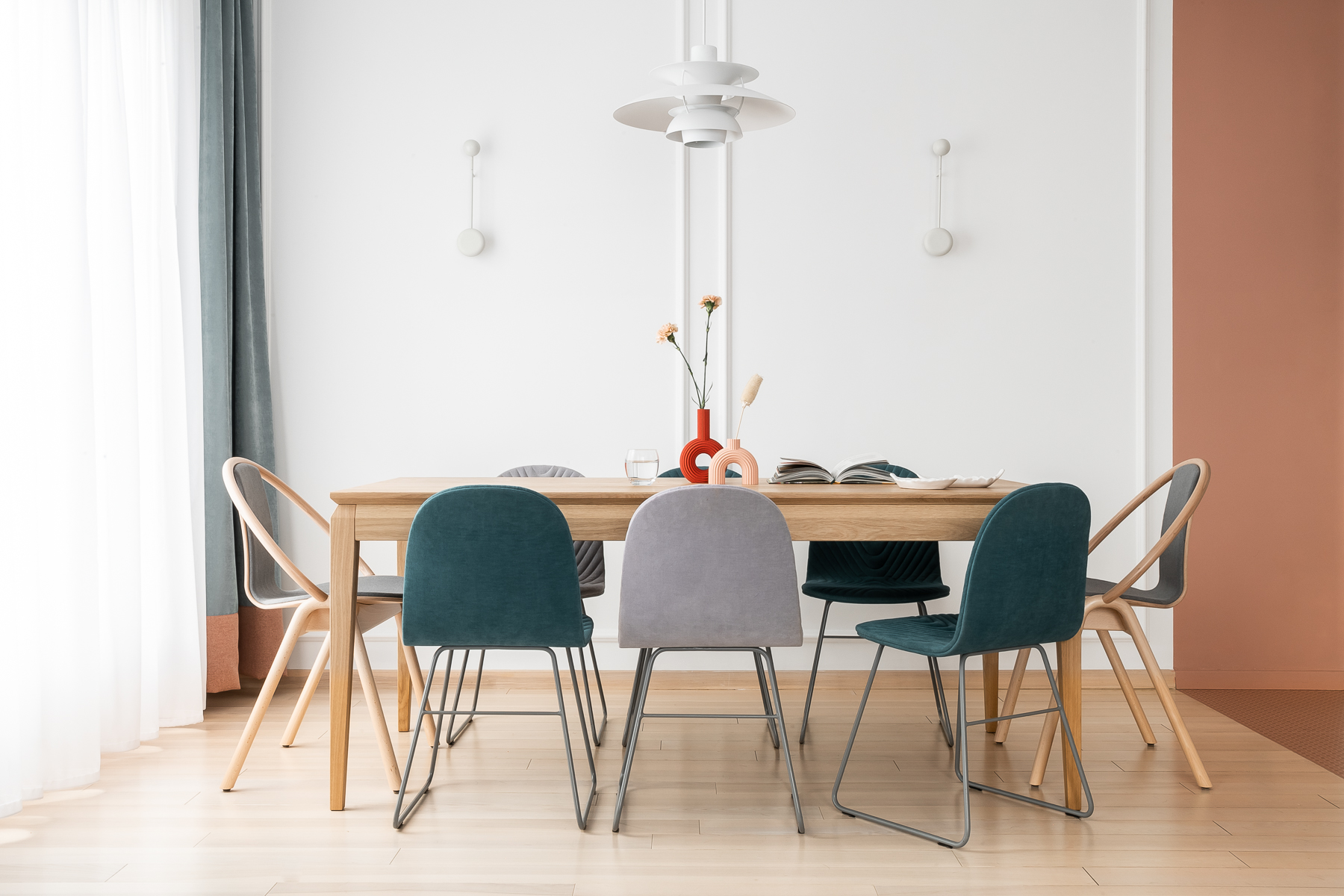 Trzeba przyznać, że dębowy stół o pięknych liniach idealnie wpisał się w to eklektyczne wnętrze. Nad stołem wisi lampa PH 5, projektu światowej sławy projektanta Poula Henningsena.