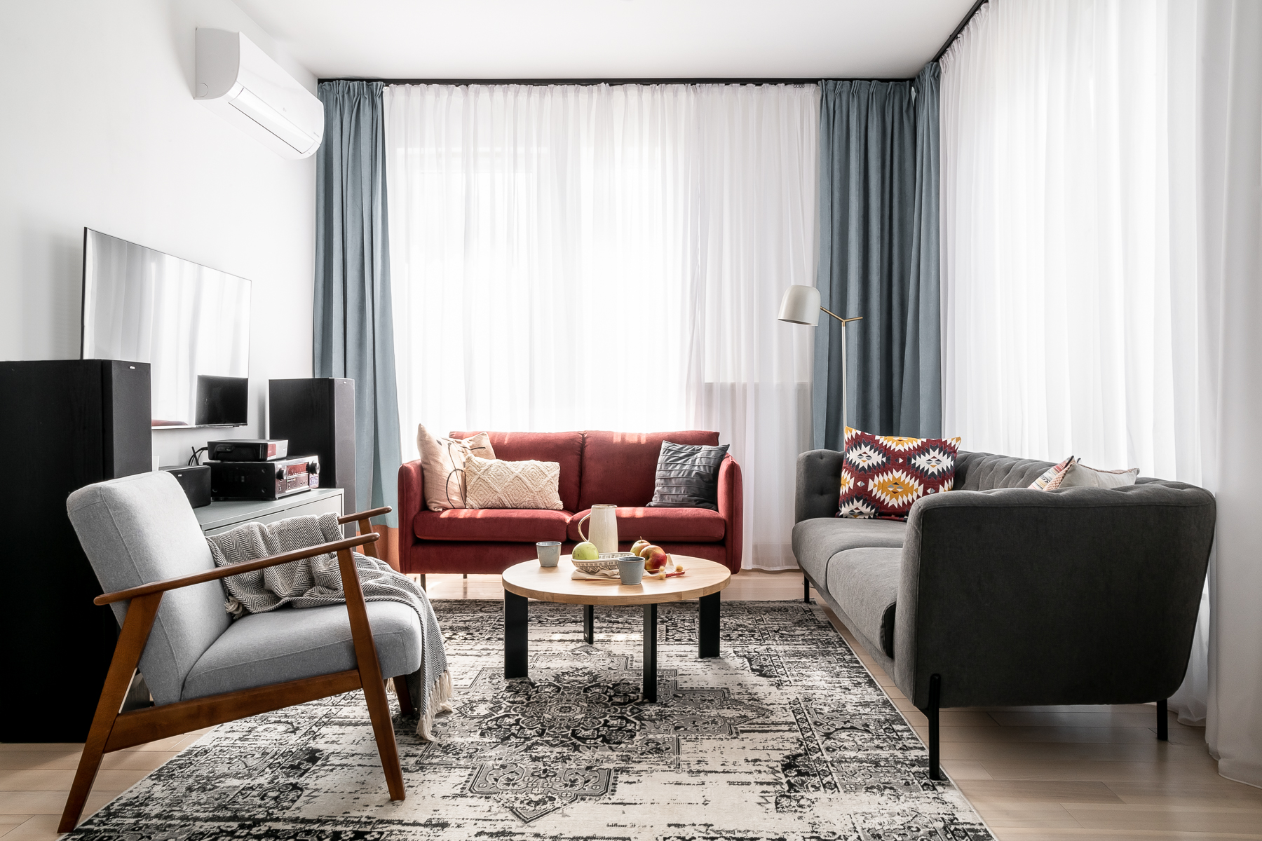 Sam salon to udany miks kolorów miedzianego, turkusu i bordo. Dwie sofy o różnych formach sprawiają, że przestrzeń telewizyjna ma teraz bardziej klubowy wyraz. Aranżację dopełnia stolik kawowy z pięknym drewnianym blatem oraz lampy Kaspa i Vibia.