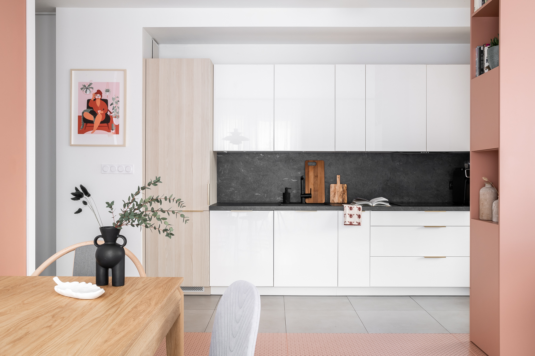 Klientka, która wcześniej stawiała w wystroju głównie na biel z szarością, zgłosiła się do Moniki Ledzion z pracowni Nom Studio, ponieważ od dawna planowała odświeżenie swojego mieszkania. Inwestorce zależało na dodaniu szczypty koloru do wnętrza, by przestrzeń lepiej oddawała jej oryginalny styl. Projektantka zdecydowała, że kilka elementów z dawnego wyposażenia może pozostać na miejscu.