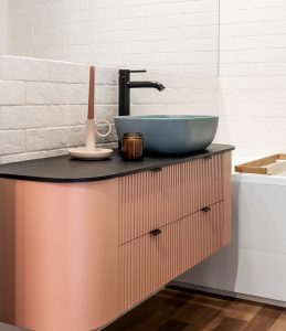 Mamy więc odświeżoną zabudowę kuchenną, szafy w białym połysku, drewnianą podłogę oraz szare kafle w korytarzu. W kuchni zdecydowano się na wymianę blatu, płyty nad blatem oraz uchwytów. Małe, kosmetyczne zmiany, dały zupełnie nowy efekt aranżacyjny, który bardzo spodobał się właścicielce. Ciekawym elementem w posadzce było pozostawienie paska z płytek gresowych w kolorze miedzianym. Kolor ten przechodzi wyżej na ścianę oraz sufit, tworząc we wnętrzu harmonię i wyznaczając wyraźny podział strefy kuchennej i salonu.