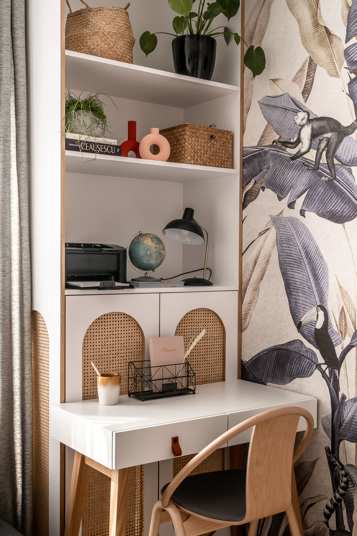 W gabinecie sprytnie ukryto grzejnik w zabudowie meblowej z elementami plecionki wiedeńskiej. Strefa pracy dzięki tapecie z tropikalnym wzorem stała się bardzo przyjemna. W gabinecie znajduje się także sofa rozkładana, przygotowana na ewentualną wizytę gości, którzy czują się tu jak we własnym domu.