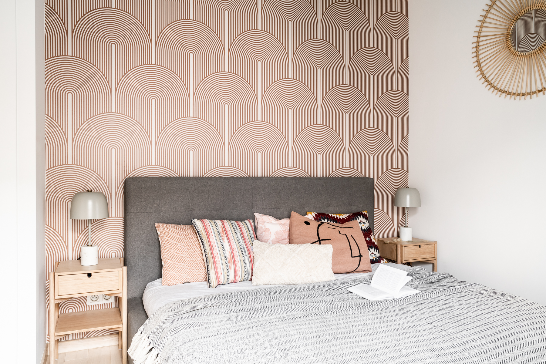 W sypialni decydowano się na dość nieoczywisty element, w postaci niebieskiego sufitu. Za łóżkiem znalazła się oryginalna tapeta z brązowym wzorem. Lampa wisząca i dodatki nawiązują do stylu boho.