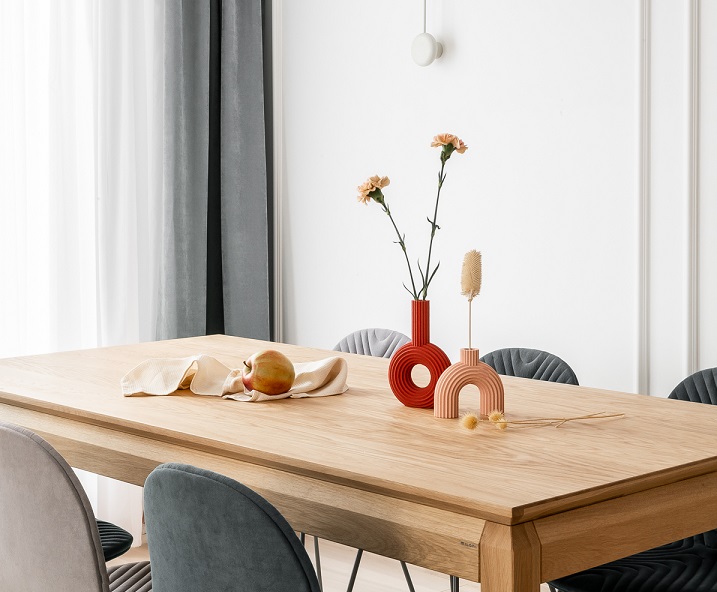 W salonie istotnym elementem okazało się wspólne wybranie właściwego stołu. Gospodyni bardzo lubi otaczać się ludźmi i ma spore grono znajomych, także stół musiał być na tyle duży, by pomieścić osiem osób. Pracownia Nom Studio poleciła jej dobrze znany model Avangarde, z polskiej manufaktury MILONI, specjalizującej się w tworzeniu pięknych stołów drewnianych na wymiar.