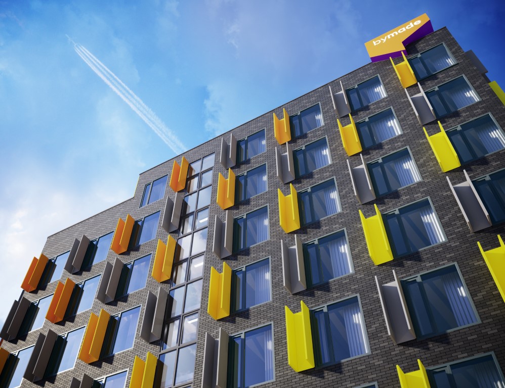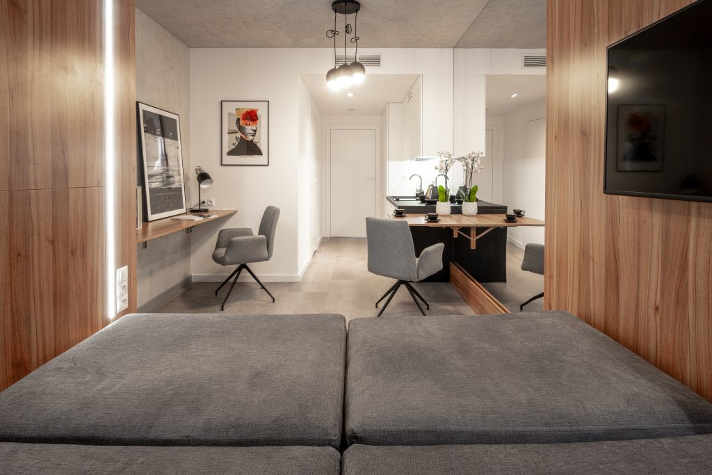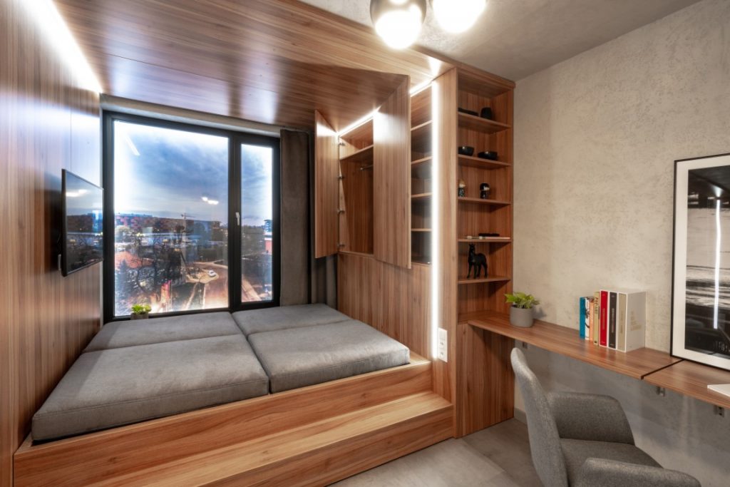 Duże okna zdeterminowały kompozycję bryły. Na jej kształt wpływ miała także konieczność zapewnienia dobrego nasłonecznienia, co zależało od układu sąsiednich budynków. To wyjaśnia wprowadzenie różnicy poziomów w bryle. Uskoki pozwalają na utworzenie tarasu widokowego, który będzie dostępny dla lokatorów. Od okna zaczęło się również projektowanie wnętrz mikroapartamentów. Pierwszoplanową rolę pełni stojące pod oknem łóżko, które w razie potrzeby można zamienić w kanapę. Rozkładane jest także biurko. To bardzo użyteczne rozwiązania, które oszczędzają miejsce.