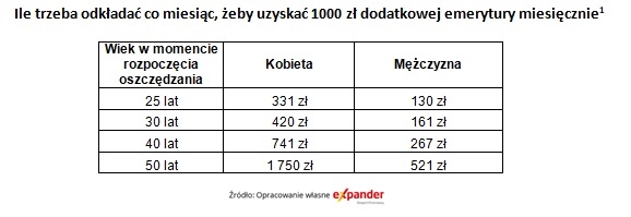 Zakładając konto emerytalne dopiero w wieku 40 czy 50 lat kobiecie będzie bardzo trudno zgromadzić odpowiednio wysokie oszczędności, które pozwolą jej poprawić swoją sytuację na emeryturze. Gdyby chciała w tym okresie wypłacać sobie z własnych oszczędności równowartość 1000 zł miesięcznie, ale oszczędzanie zaczęłaby dopiero w wieku 50-ciu lat, to co miesiąc musiałaby odkładać aż ok. 1750 zł. To bardzo duże obciążenie. Na tyle wysokie, że przy przeciętnych dochodach zapewne nie będzie możliwe do zrealizowania. Zaczynając oszczędzanie w 40 roku życia kwota do odłożenia co miesiąc wyniosłaby 741 zł, czyli wciąż bardzo dużo. Najłatwiej będzie rozpocząć oszczędzanie mając 25 lat, wtedy wystarczy już 331 zł miesięcznie.