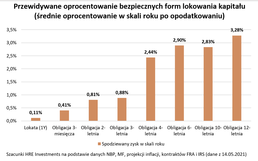 Trzeba mieć świadomość, że tylko część obligacji jest w stanie uchronić nas przed utratą siły nabywczej przez nasze oszczędności. W zależności od tego które papiery wybierzemy lub które będziemy mogli kupić, to potrafią one chronić przed inflacją na poziomie od 2 do maksymalnie 5%. Gdy inflacja przyspiesza, to niestety naszą dodatkową marżę zysku konsumuje podatek od odsetek, który jest nieodłącznym elementem inwestowania w obligacje skarbowe. Nie zmienia to jednak faktu, że wiele osób straciło dziś wiarę w niemal nieoprocentowane lokaty i wybierają w ich miejsce detaliczne papiery skarbowe, fundusze inwestycyjne czy nieruchomości.