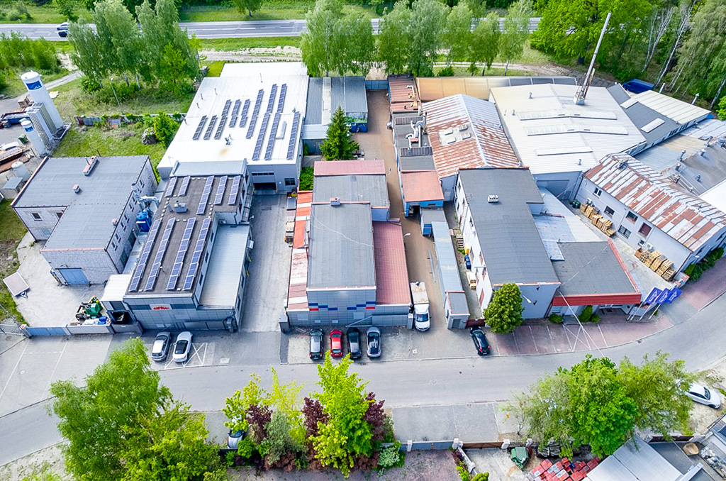 Dodatkowa część biurowo-mieszkalna umożliwia prowadzenie działalności oraz zakwaterowanie pracowników w jednym miejscu.