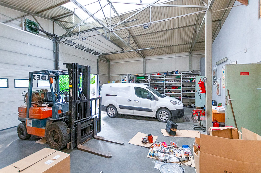 Przemyślany układ pomieszczeń tworzy funkcjonalną i kompleksowo wyposażoną przestrzeń, idealną do prowadzenia działalności. Dla zmotoryzowanych przygotowano parking. W części magazynowo-warsztatowej zastosowano niepylną posadzkę betonową zapewniającą trwałą i odporną powierzchnię idealną do składowania materiałów, obsługi maszyn oraz prowadzenia prac serwisowych.