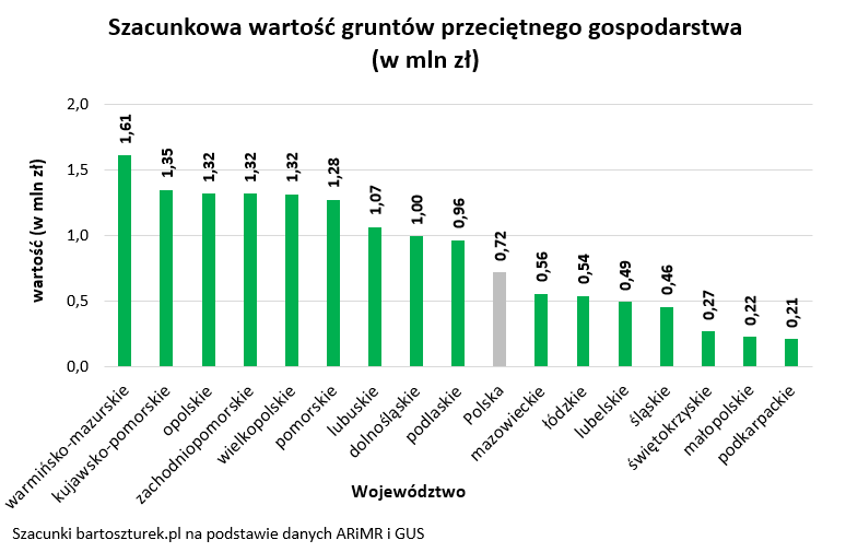 W aż 7 województwach grunty przeciętnego gospodarstwa rolnego warte są ponad milion złotych. Rekord tradycyjnie padł na Warmii i Mazurach, gdzie przeciętne gospodarstwo ma już ponad 24 hektary, a ceny są na tyle wysokie, że średnia wartość gospodarstwa przekroczyła 1,6 miliona.