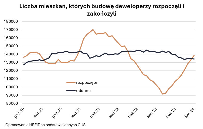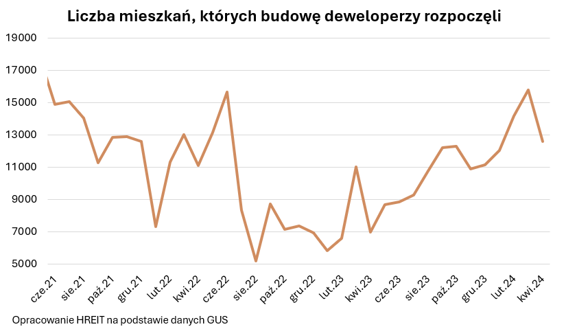 W głównej mierze tak dobry odczyt zawdzięczamy deweloperom. Ci zaczęli w kwietniu budować prawie 12,6 tysięcy mieszkań, a więc o ponad 80% więcej niż w czwartym miesiącu 2023 roku – wynika z danych GUS. Tak duża dynamika jest też pokłosiem niskiej bazy sprzed roku. Po prostu w kwietniu 2023 roku aktywność budowlana deweloperów była niewielka. Niepokojąca jest za to informacja, że w kwietniu deweloperzy zaczęli budować o 20% mniej nowych mieszkań niż miesiąc wcześniej. Póki co zmiana ta o niczym jeszcze nie przesądza, bo może wynikać np. z sezonowości.